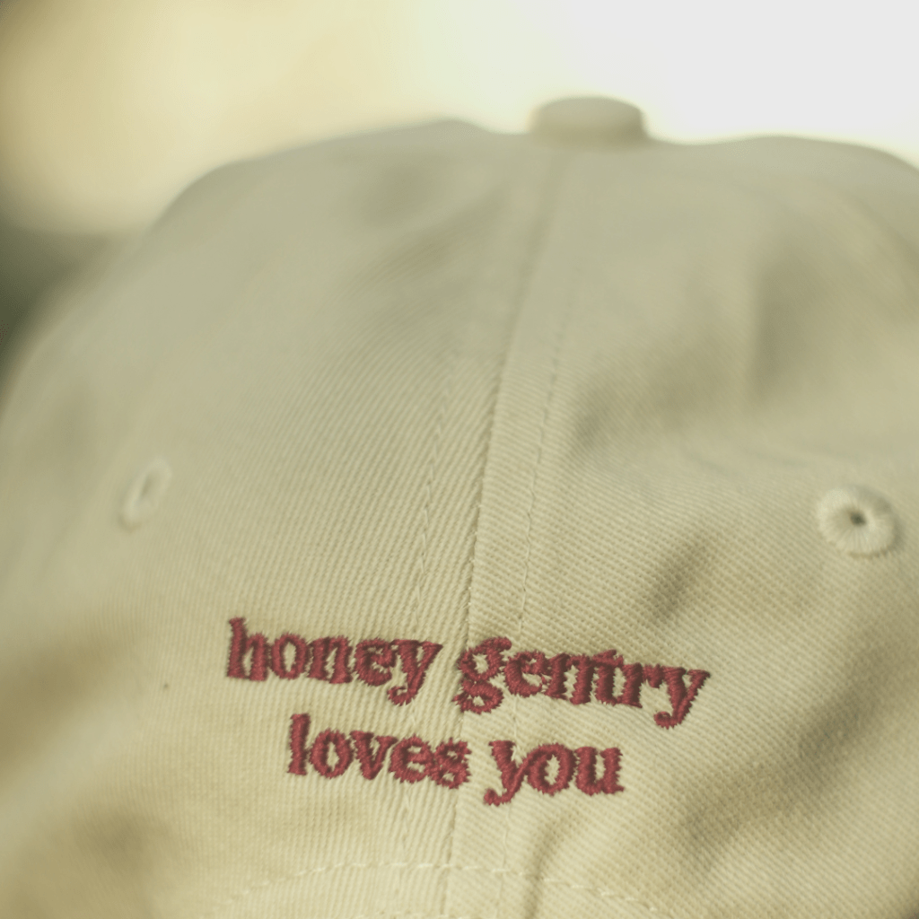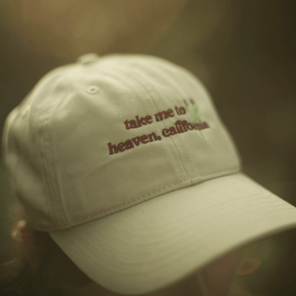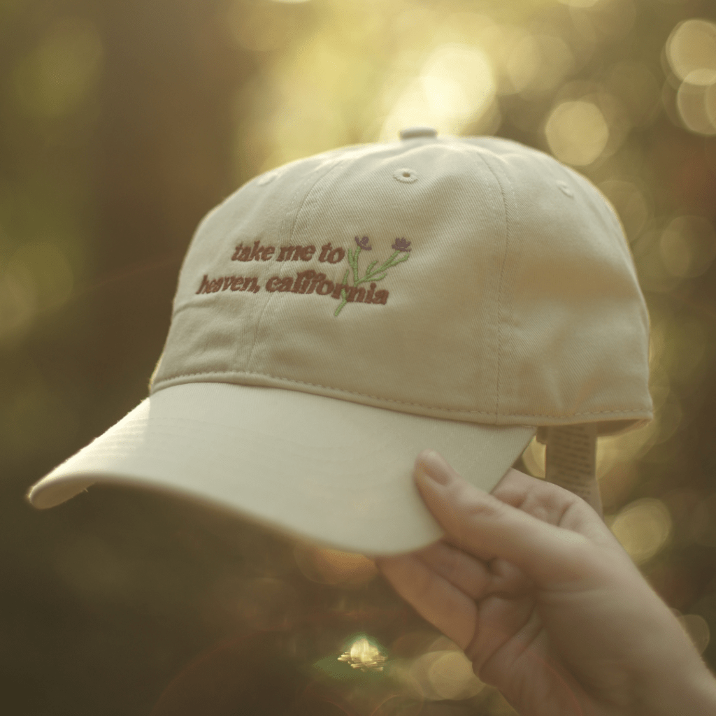 on the front: embroidered take me to heaven california with wildflower detail. on the back: honey gentry loves you